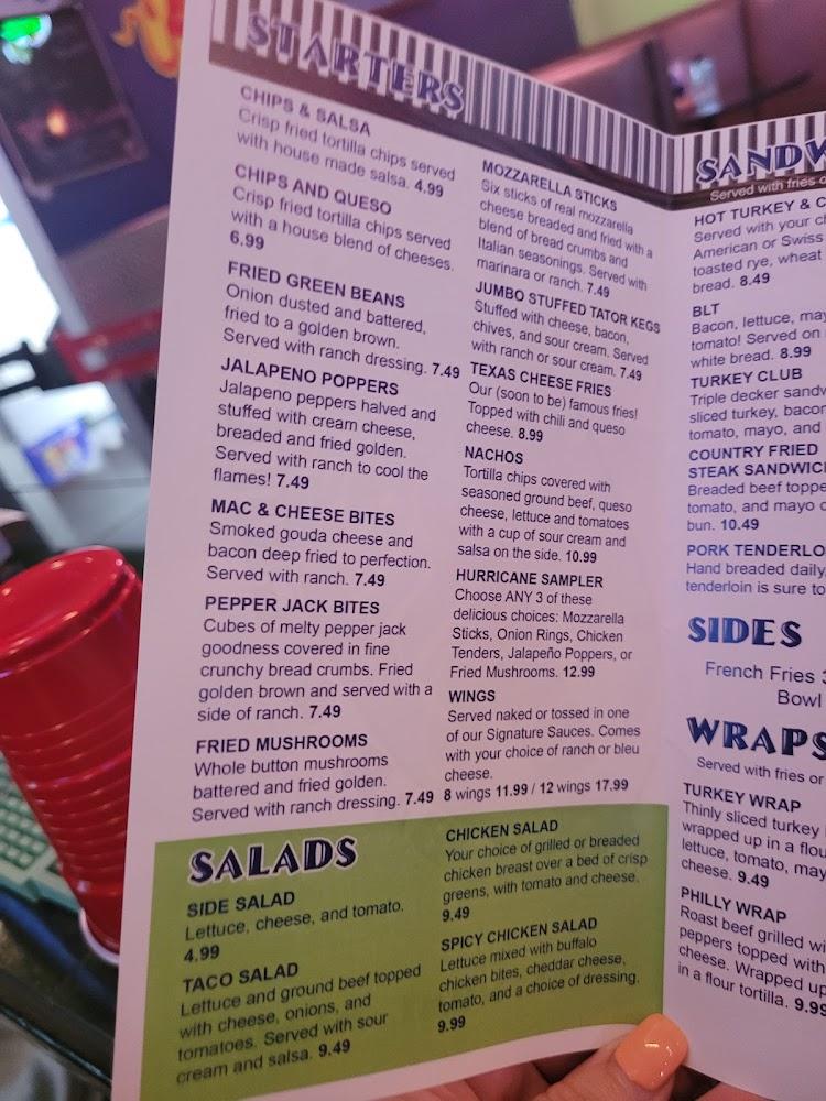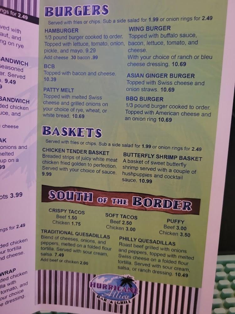 The menu at Hurricane Allie's offers a blend of classic bar favorites and local treats. Start with crispy jalapeno poppers or the popular chips and queso. The burger selection stands out, with options ranging from a classic hamburger to the Asian ginger burger. For those craving something lighter, the salads, including spicy chicken salad, are refreshing. The South of the Border section showcases tacos and quesadillas. Plus, don’t miss out on their sweet treats like funnel cake fries. With 79 options, there's something for everyone!